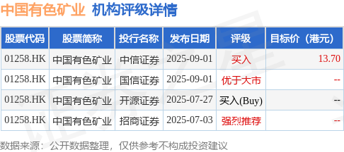 投行对该股的评级以强烈推荐为主,近90天内共有1家投行给出强烈推荐评级,近90天的目标均价为13.7港元。中信证券最新一份研报给予中国有色矿业买入评级,目标价13.7港元。