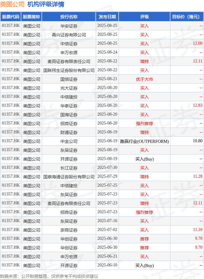 投行对该股的评级以买入为主,近90天内共有16家投行给出买入评级,近90天的目标均价为11.29港元。华安证券最新一份研报给予美图公司买入评级。