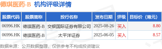 投行对该股的评级以买入为主,近90天内共有2家投行给出买入评级,近90天的目标均价为8.68港元。交银国际证券有限公司最新一份研报给予德琪医药-B买入评级,目标价8.8港元。
