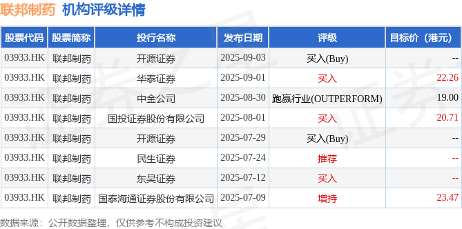 投行对该股的评级以买入为主,近90天内共有3家投行给出买入评级,近90天的目标均价为21.36港元。开源证券最新一份研报给予联邦制药买入(Buy)评级。