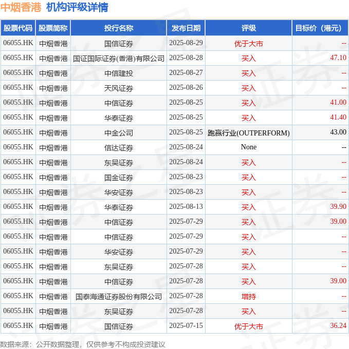 投行对该股的评级以买入为主,近90天内共有15家投行给出买入评级,近90天的目标均价为40.83港元。国信证券最新一份研报给予中烟香港优于大市评级。