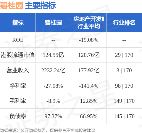 碧桂园港股市值124.55亿港元,在房地产开发Ⅱ行业中排名第29。主要指标见下表: