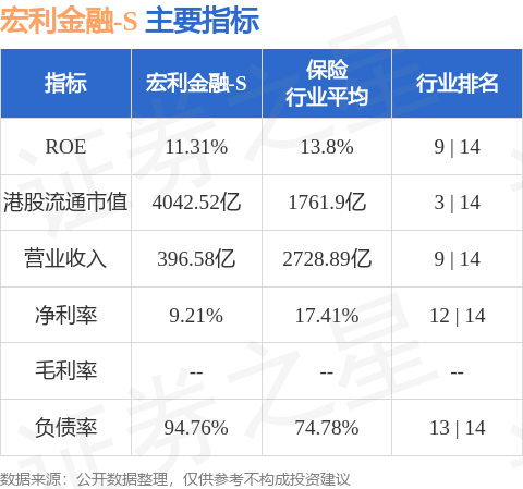 宏利金融-S港股市值4042.52亿港元,在保险行业中排名第3。主要指标见下表: