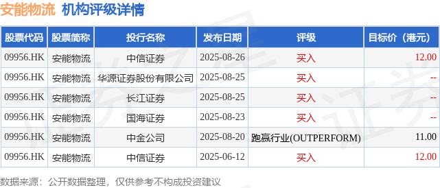 投行对该股的评级以买入为主,近90天内共有5家投行给出买入评级,近90天的目标均价为11.67港元。中信证券最新一份研报给予安能物流买入评级,目标价12港元。
