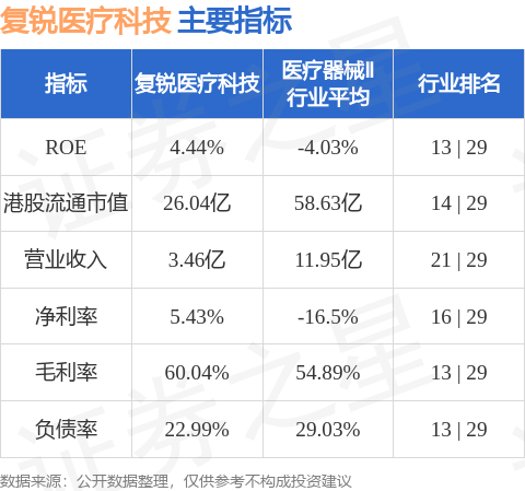 复锐医疗科技港股市值26.04亿港元,在医疗器械Ⅱ行业中排名第14。主要指标见下表: