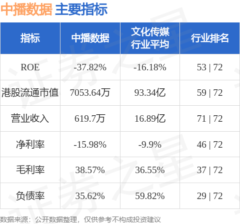 中播数据港股市值7053.64万港元,在文化传媒行业中排名第59。主要指标见下表: