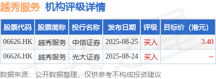 截至2025年9月8日收盘,越秀服务(06626.HK)报收于2.69港元,上涨0.37%,成交量49.9万股,成交额134.1万港元。投行对该股的评级以买入为主,近90天内共有2家投行给出买入评级,近90天的目标均价为3.4港元。中信证券最新一份研报给予越秀服务买入评级,目标价3.4港元。