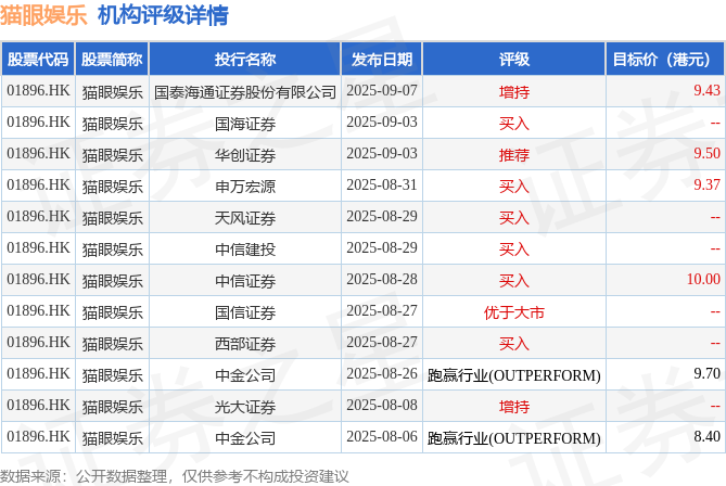 投行对该股的评级以买入为主,近90天内共有6家投行给出买入评级,近90天的目标均价为9.4港元。国泰海通证券股份有限公司最新一份研报给予猫眼娱乐增持评级,目标价9.43港元。