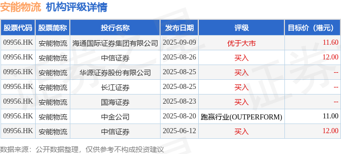 截至2025年9月9日收盘,安能物流(09956.HK)报收于9.42港元,下跌2.48%,成交量948.76万股,成交额9176.09万港元。投行对该股的评级以买入为主,近90天内共有5家投行给出买入评级,近90天的目标均价为11.65港元。海通国际证券集团有限公司最新一份研报给予安能物流优于大市评级,目标价11.6港元。