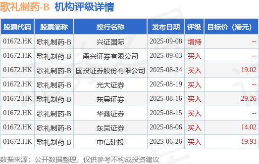 截至2025年9月9日收盘,歌礼制药-B(01672.HK)报收于14.15港元,上涨0.28%,成交量544.75万股,成交额7572.64万港元。投行对该股的评级以买入为主,近90天内共有7家投行给出买入评级,近90天的目标均价为20.56港元。兴证国际最新一份研报给予歌礼制药-B增持评级。