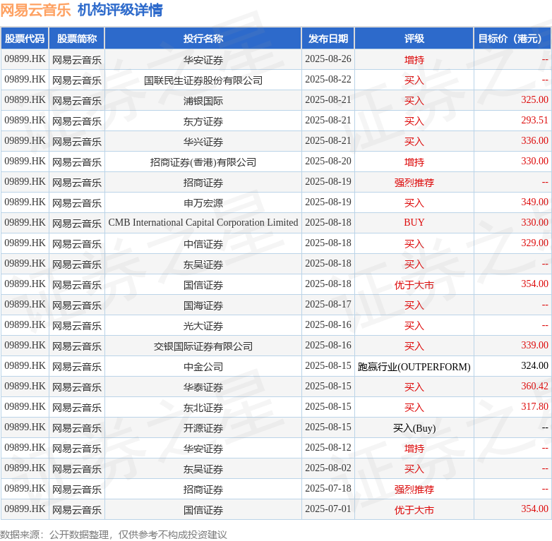 投行对该股的评级以买入为主,近90天内共有13家投行给出买入评级,近90天的目标均价为333.98港元。华安证券最新一份研报给予网易云音乐增持评级。