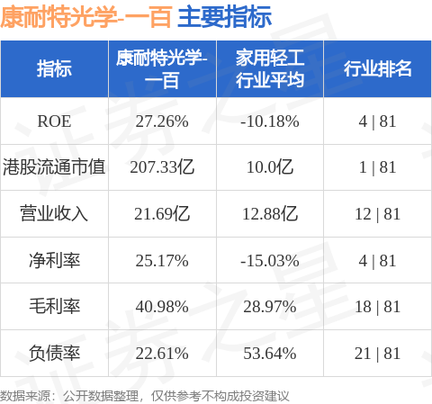 康耐特光学-一百港股市值207.33亿港元,在家用轻工行业中排名第1。主要指标见下表: