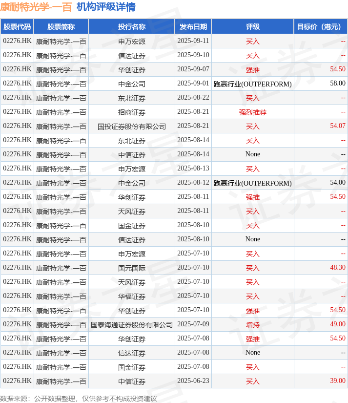 截至2025年9月11日收盘,康耐特光学-一百(02276.HK)报收于43.46港元,上涨0.99%,成交量260.81万股,成交额1.15亿港元。投行对该股的评级以买入为主,近90天内共有14家投行给出买入评级,近90天的目标均价为52.04港元。申万宏源最新一份研报给予康耐特光学-一百买入评级。