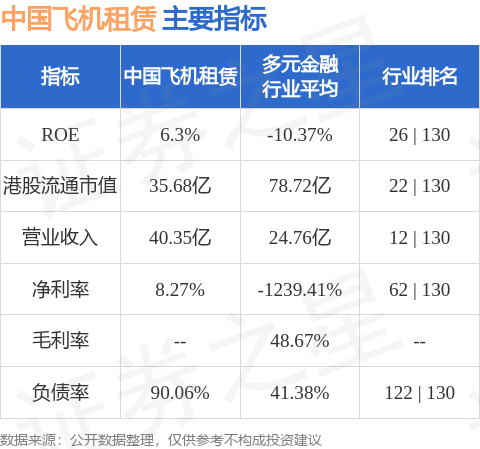 中国飞机租赁港股市值35.68亿港元,在多元金融行业中排名第22。主要指标见下表: