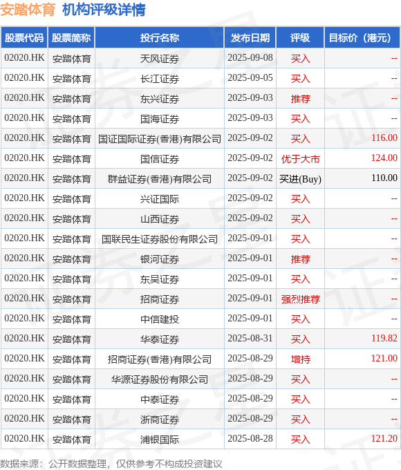 投行对该股的评级以买入为主,近90天内共有45家投行给出买入评级,近90天的目标均价为118.61港元。天风证券最新一份研报给予安踏体育买入评级。