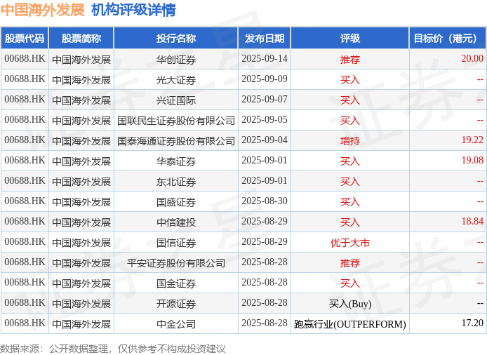 投行对该股的评级以买入为主,近90天内共有8家投行给出买入评级,近90天的目标均价为18.87港元。华创证券最新一份研报给予中国海外发展推荐评级,目标价20港元。