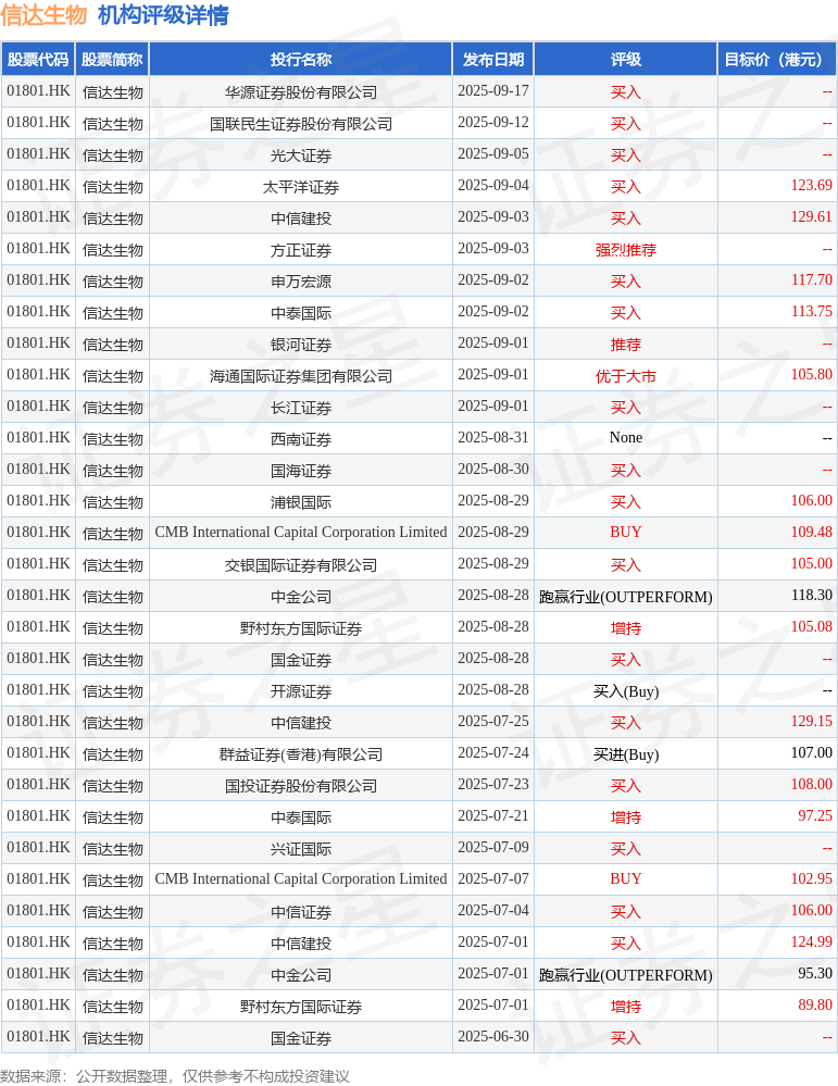 截至2025年9月19日收盘,信达生物(01801.HK)报收于92.05港元,下跌5.44%,成交量3461.84万股,成交额31.95亿港元。投行对该股的评级以买入为主,近90天内共有18家投行给出买入评级,近90天的目标均价为110.26港元。华源证券股份有限公司最新一份研报给予信达生物买入评级。