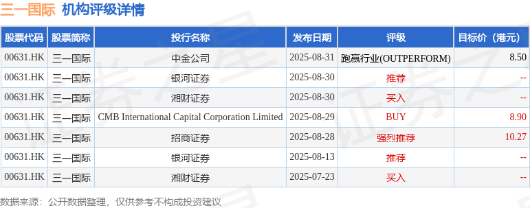 投行对该股的评级以推荐为主,近90天内共有2家投行给出推荐评级,近90天的目标均价为9.22港元。中金公司最新一份研报给予三一国际跑赢行业(OUTPERFORM)评级,目标价8.5港元。