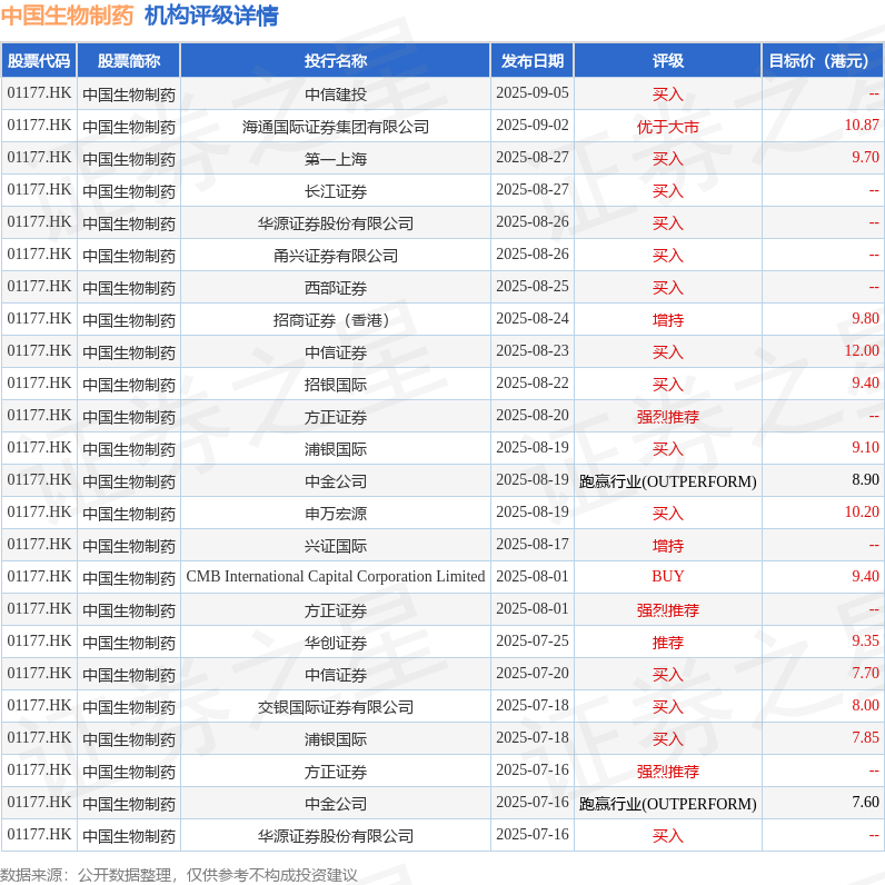 截至2025年9月22日收盘,中国生物制药(01177.HK)报收于8.52港元,上涨0.71%,成交量1.03亿股,成交额8.76亿港元。投行对该股的评级以买入为主,近90天内共有14家投行给出买入评级,近90天的目标均价为9.28港元。中信建投最新一份研报给予中国生物制药买入评级。