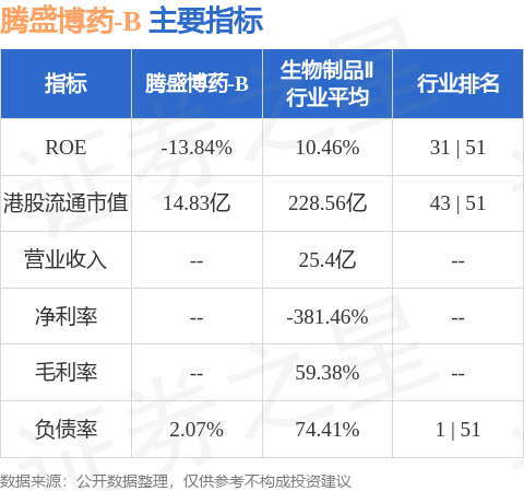 腾盛博药-B港股市值14.83亿港元,在生物制品Ⅱ行业中排名第43。主要指标见下表:
