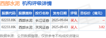 投行对该股的评级以买入为主,近90天内共有2家投行给出买入评级,近90天的目标均价为3.82港元。长江证券最新一份研报给予西部水泥买入评级。