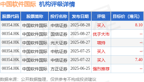 截至2025年9月23日收盘,中国软件国际(00354.HK)报收于6.07港元,下跌2.72%,成交量4386.8万股,成交额2.65亿港元。投行对该股的评级以买入为主,近90天内共有3家投行给出买入评级,近90天的目标均价为7.75港元。中信证券最新一份研报给予中国软件国际买入评级,目标价8.1港元。
