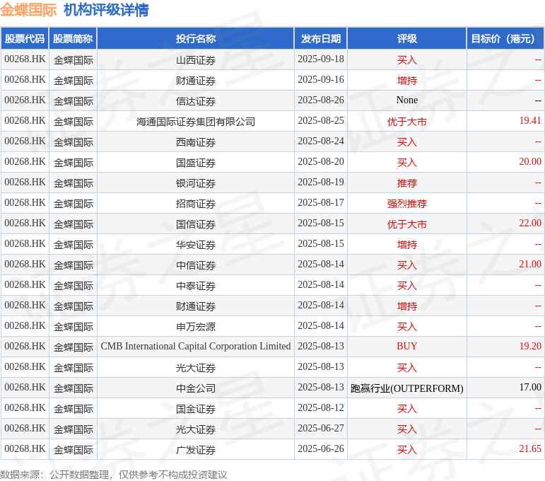 投行对该股的评级以买入为主,近90天内共有10家投行给出买入评级,近90天的目标均价为20.04港元。山西证券最新一份研报给予金蝶国际买入评级。