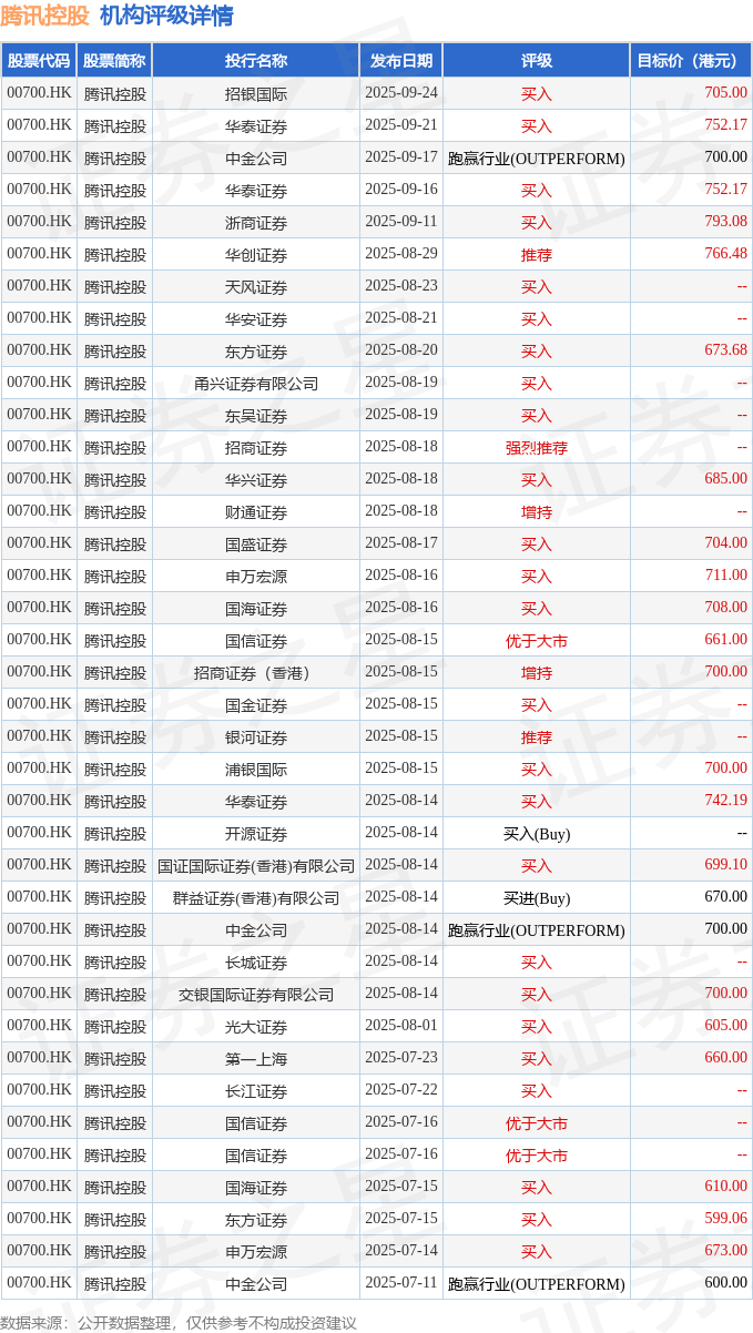 投行对该股的评级以买入为主,近90天内共有25家投行给出买入评级,近90天的目标均价为690.8港元。招银国际最新一份研报给予腾讯控股买入评级,目标价705港元。