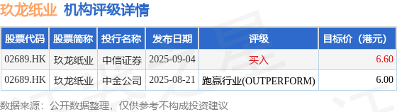 截至2025年9月24日收盘,玖龙纸业(02689.HK)报收于5.87港元,下跌2.0%,成交量798.45万股,成交额4679.47万港元。投行对该股的评级以跑赢行业(OUTPERFORM)为主,近90天内共有1家投行给出跑赢行业(OUTPERFORM)评级,近90天的目标均价为6.3港元。中信证券最新一份研报给予玖龙纸业买入评级,目标价6.6港元。