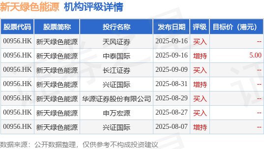 截至2025年9月24日收盘,新天绿色能源(00956.HK)报收于4.2港元,上涨0.72%,成交量509.5万股,成交额2143.34万港元。投行对该股的评级以买入为主,近90天内共有4家投行给出买入评级,近90天的目标均价为5港元。天风证券最新一份研报给予新天绿色能源买入评级。