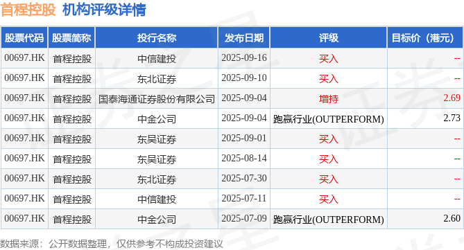 投行对该股的评级以买入为主,近90天内共有6家投行给出买入评级,近90天的目标均价为2.67港元。中信建投最新一份研报给予首程控股买入评级。