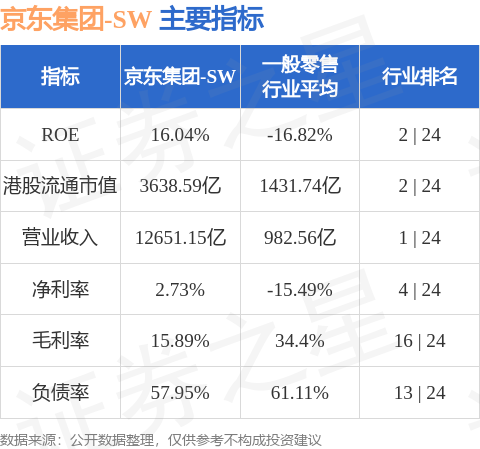京东集团-SW港股市值3638.59亿港元,在一般零售行业中排名第2。主要指标见下表: