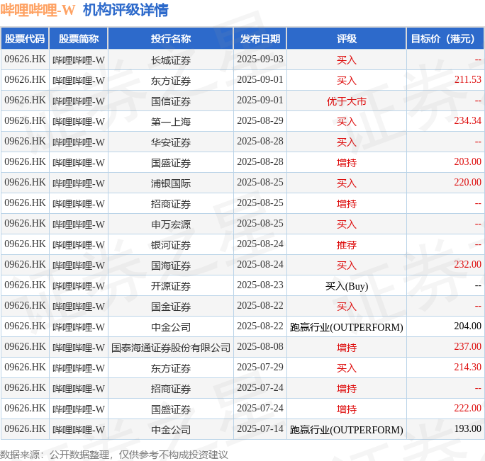 投行对该股的评级以买入为主,近90天内共有9家投行给出买入评级,近90天的目标均价为217.12港元。长城证券最新一份研报给予哔哩哔哩-W买入评级。