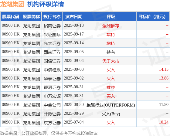 截至2025年9月26日收盘,龙湖集团(00960.HK)报收于11.25港元,下跌1.32%,成交量3142.84万股,成交额3.66亿港元。投行对该股的评级以买入为主,近90天内共有4家投行给出买入评级,近90天的目标均价为12.44港元。招商证券最新一份研报给予龙湖集团强烈推荐评级。