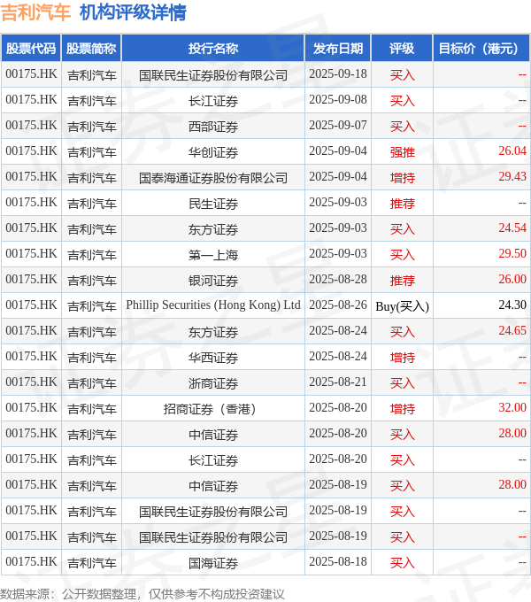 截至2025年9月26日收盘,吉利汽车(00175.HK)报收于18.23港元,下跌1.19%,成交量5135.93万股,成交额9.47亿港元。投行对该股的评级以买入为主,近90天内共有30家投行给出买入评级,近90天的目标均价为26.53港元。国联民生证券股份有限公司最新一份研报给予吉利汽车买入评级。