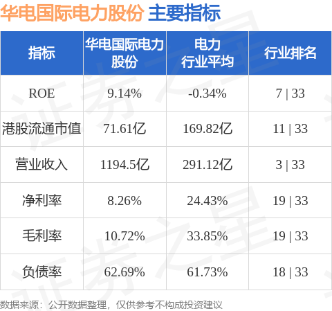 华电国际电力股份港股市值71.61亿港元,在电力行业中排名第11。主要指标见下表: