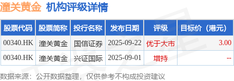 截至2025年9月29日收盘,潼关黄金(00340.HK)报收于2.79港元,上涨6.08%,成交量4900.19万股,成交额1.36亿港元。投行对该股的评级以增持为主,近90天内共有1家投行给出增持评级,近90天的目标均价为3港元。国信证券最新一份研报给予潼关黄金优于大市评级,目标价3港元。