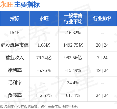 永旺港股市值1.08亿港元,在一般零售行业中排名第20。主要指标见下表: