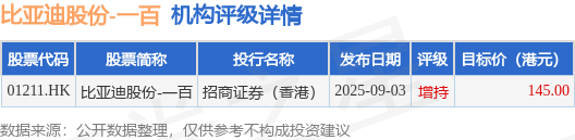 投行对该股的评级以增持为主,近90天内共有1家投行给出增持评级,近90天的目标均价为145港元。招商证券(香港)最新一份研报给予比亚迪股份-一百增持评级,目标价145港元。