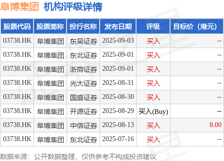 投行对该股的评级以买入为主,近90天内共有7家投行给出买入评级,近90天的目标均价为8港元。东吴证券最新一份研报给予阜博集团买入评级。