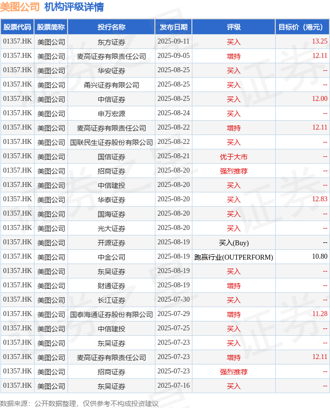 投行对该股的评级以买入为主,近90天内共有15家投行给出买入评级,近90天的目标均价为12.06港元。东方证券最新一份研报给予美图公司买入评级,目标价13.25港元。