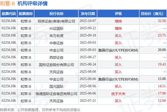 投行对该股的评级以买入为主,近90天内共有7家投行给出买入评级,近90天的目标均价为19.46港元。招商证券(香港)有限公司最新一份研报给予和誉-B增持评级,目标价32.5港元。