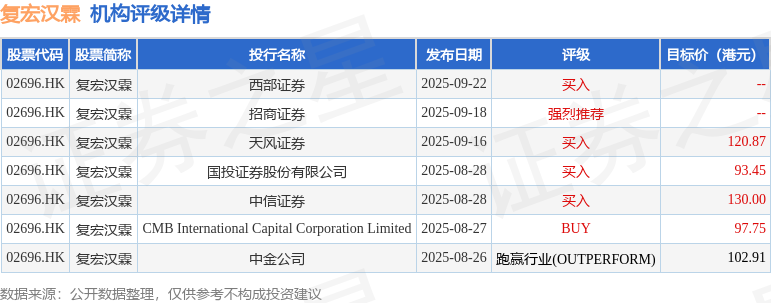 截至2025年10月9日收盘,复宏汉霖(02696.HK)报收于75.75港元,下跌4.36%,成交量169.03万股,成交额1.28亿港元。投行对该股的评级以买入为主,近90天内共有4家投行给出买入评级,近90天的目标均价为109港元。西部证券最新一份研报给予复宏汉霖买入评级。