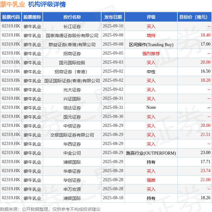 截至2025年10月9日收盘,蒙牛乳业(02319.HK)报收于14.6港元,上涨2.53%,成交量2897.92万股,成交额4.23亿港元。投行对该股的评级以买入为主,近90天内共有11家投行给出买入评级,近90天的目标均价为19.61港元。长江证券最新一份研报给予蒙牛乳业买入评级。
