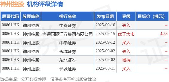 截至2025年10月9日收盘,神州控股(00861.HK)报收于3.08港元,上涨1.65%,成交量517.92万股,成交额1602.64万港元。投行对该股的评级以买入为主,近90天内共有4家投行给出买入评级,近90天的目标均价为4.23港元。中泰证券最新一份研报给予神州控股买入评级。