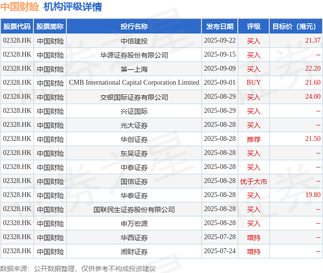 截至2025年10月9日收盘,中国财险(02328.HK)报收于18.39港元,上涨2.97%,成交量2384.5万股,成交额4.33亿港元。投行对该股的评级以买入为主,近90天内共有11家投行给出买入评级,近90天的目标均价为21.75港元。中信建投最新一份研报给予中国财险买入评级,目标价21.37港元。