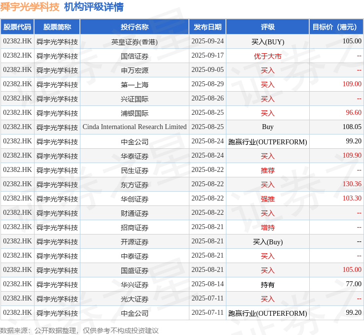 截至2025年10月9日收盘,舜宇光学科技(02382.HK)报收于87.9港元,下跌1.35%,成交量903.43万股,成交额8.04亿港元。投行对该股的评级以买入为主,近90天内共有10家投行给出买入评级,近90天的目标均价为103.87港元。英皇证券(香港)最新一份研报给予舜宇光学科技买入(BUY)评级,目标价105港元。