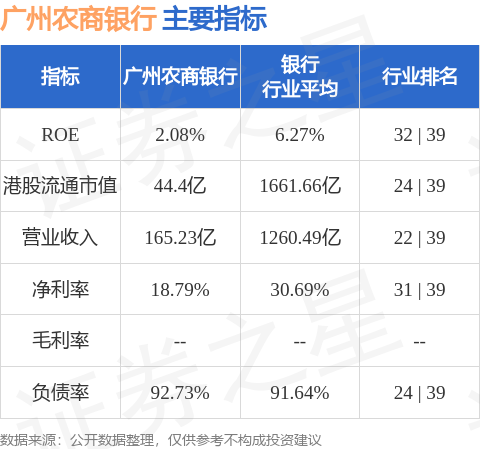 广州农商银行港股市值44.4亿港元,在银行行业中排名第24。主要指标见下表: