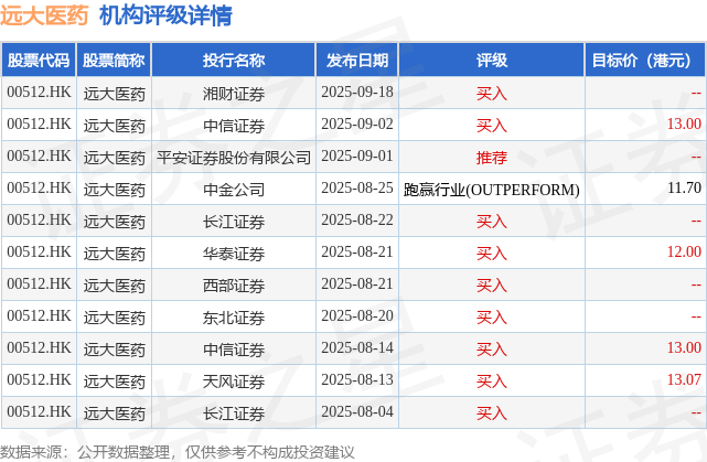 投行对该股的评级以买入为主,近90天内共有9家投行给出买入评级,近90天的目标均价为12.55港元。湘财证券最新一份研报给予远大医药买入评级。