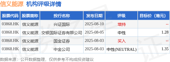 截至2025年10月10日收盘,信义能源(03868.HK)报收于1.37港元,下跌1.44%,成交量1735.0万股,成交额2391.45万港元。投行对该股的评级以增持为主,近90天内共有1家投行给出增持评级,近90天的目标均价为1.32港元。兴证国际最新一份研报给予信义能源增持评级。